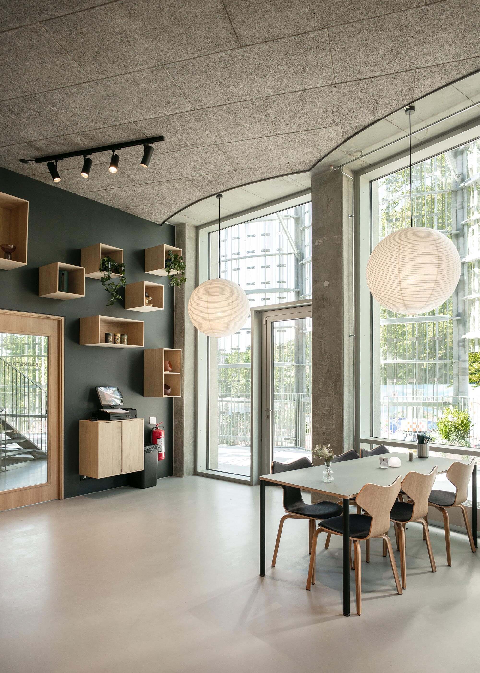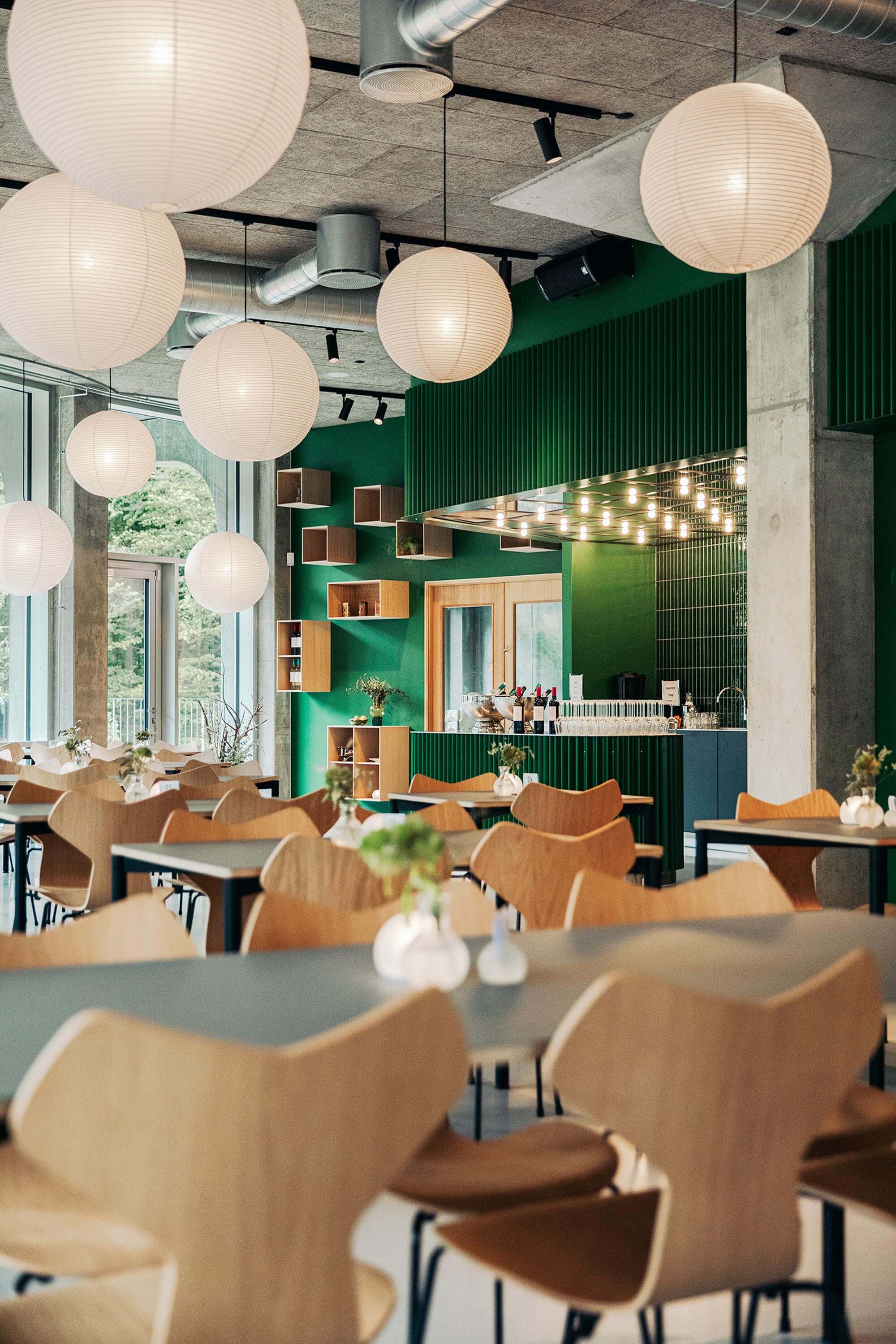 Bag en 180 grader transparent glasfacade ligger restaurantområdet med udsigt over Svanesøen. Glasfacaden kan åbnes, så der skabes tæt kontakt mellem inde og ude.