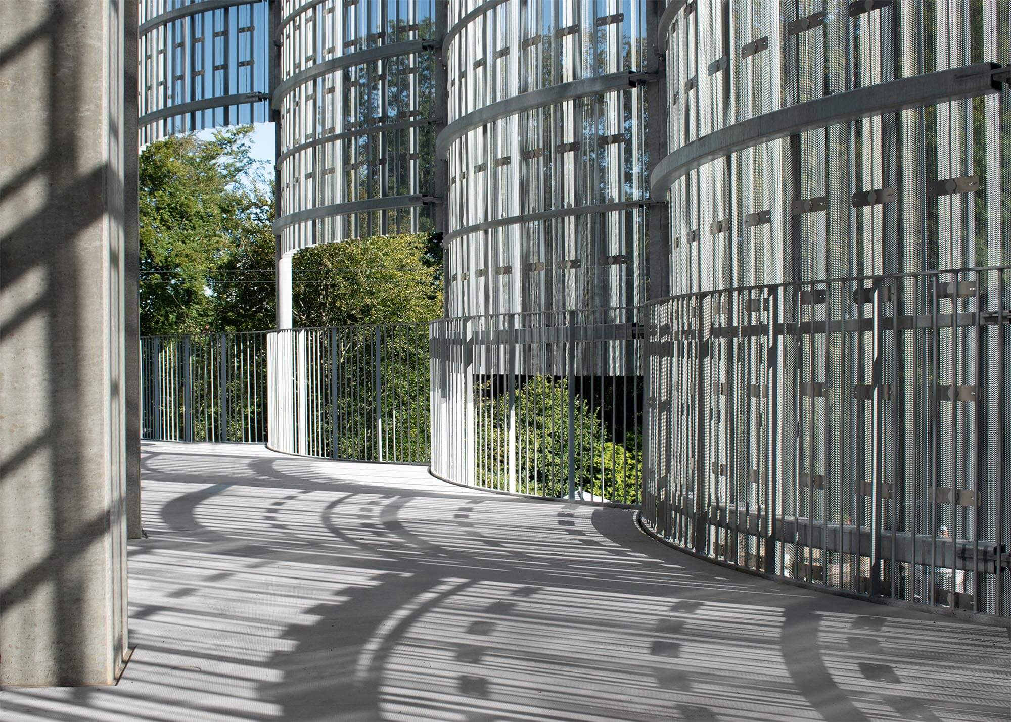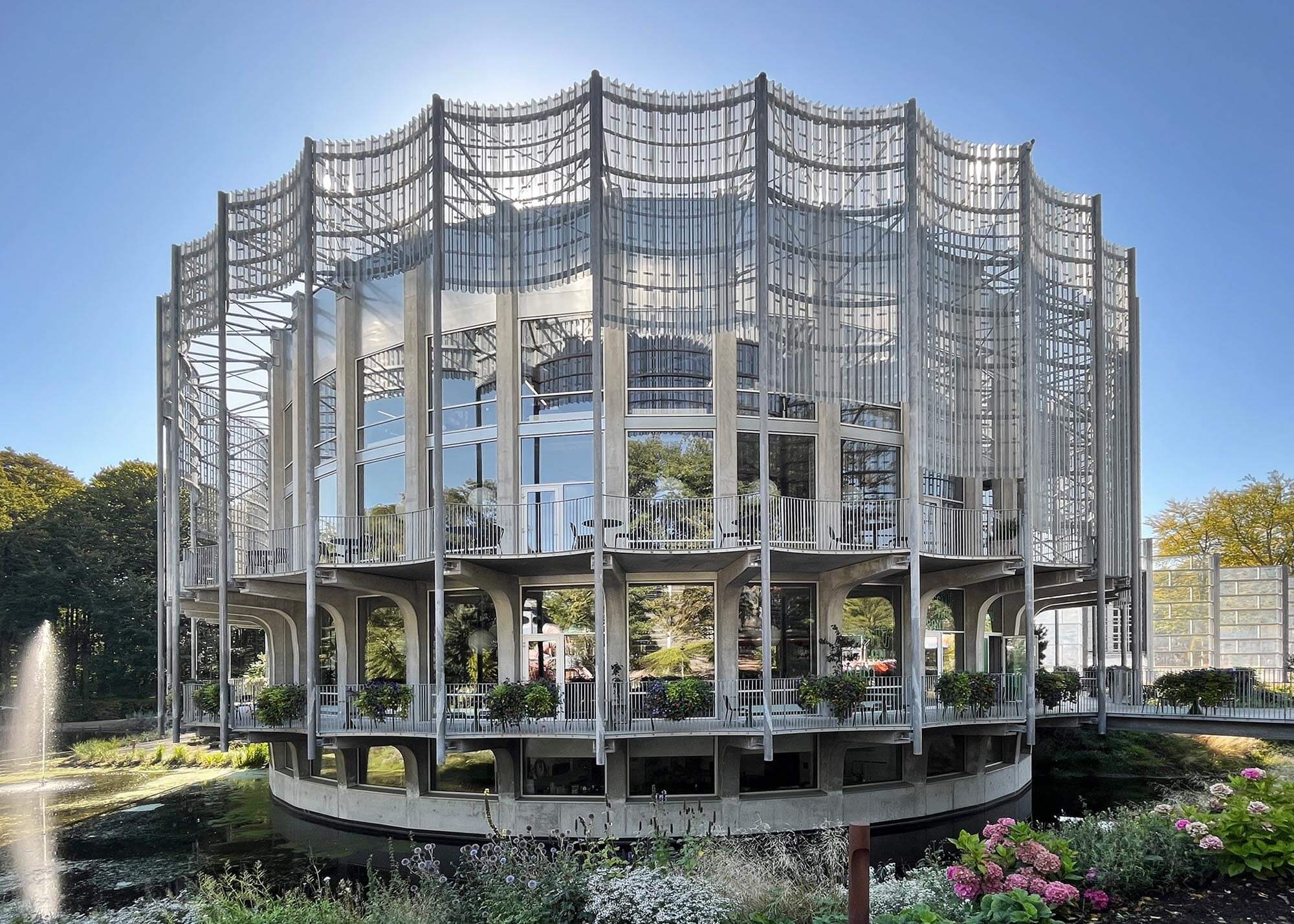 Konstruktionerne er adskilt og et lydisolerende lag mellem de to konstruktioner sikrer, at lyden fra scenen ikke forplanter sig til restauranterne. De to konstruktioner bindes sammen af en skærm i perforeret zink med bagbelysning, der kan tilpasses arrangementerne på scenen.