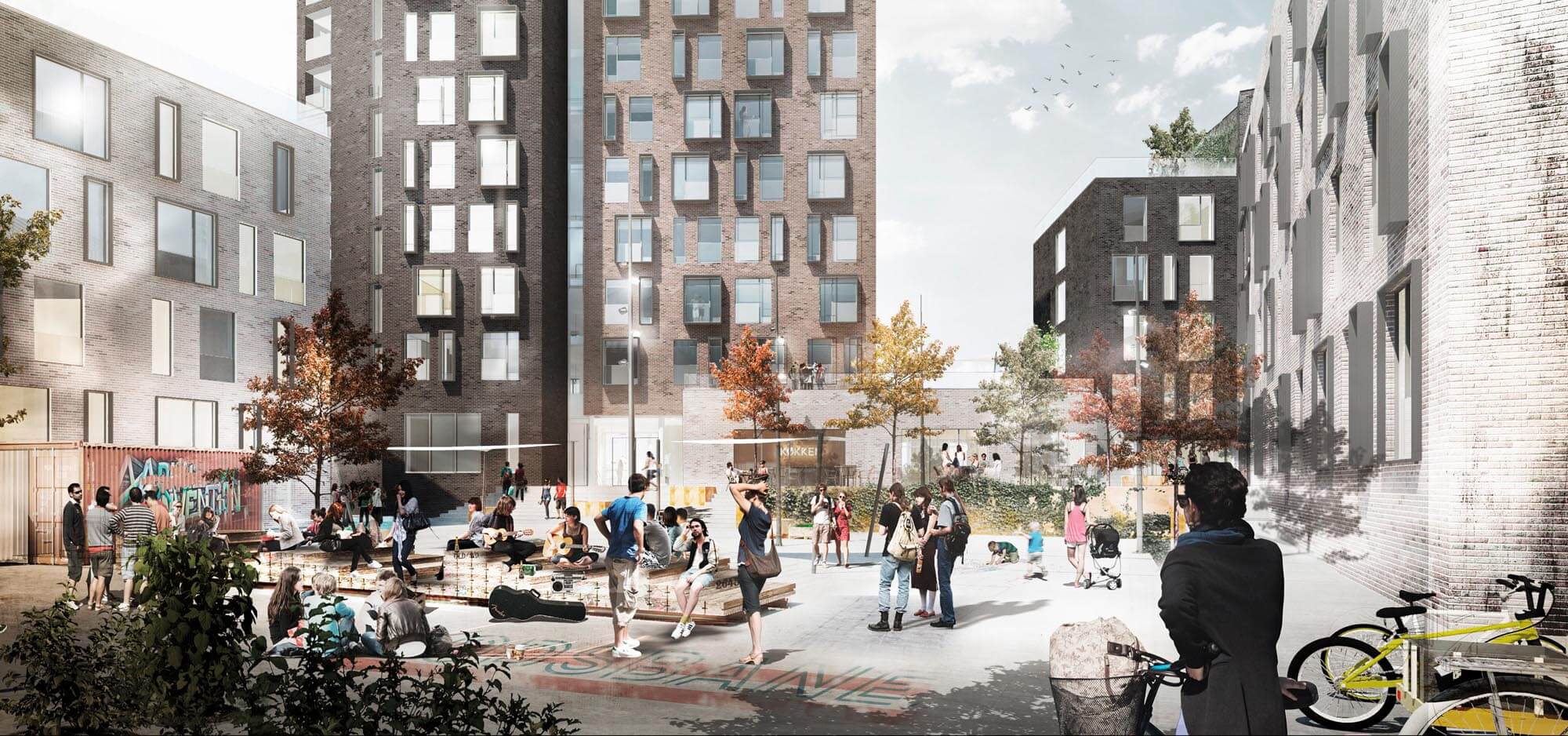 Dertil er etableret et ”studiestræde” med fællesfaciliteter, aktive gårdrum og 5 orangerier på de grønne tagterrasser, der danner rammen for det sociale fællesskab.