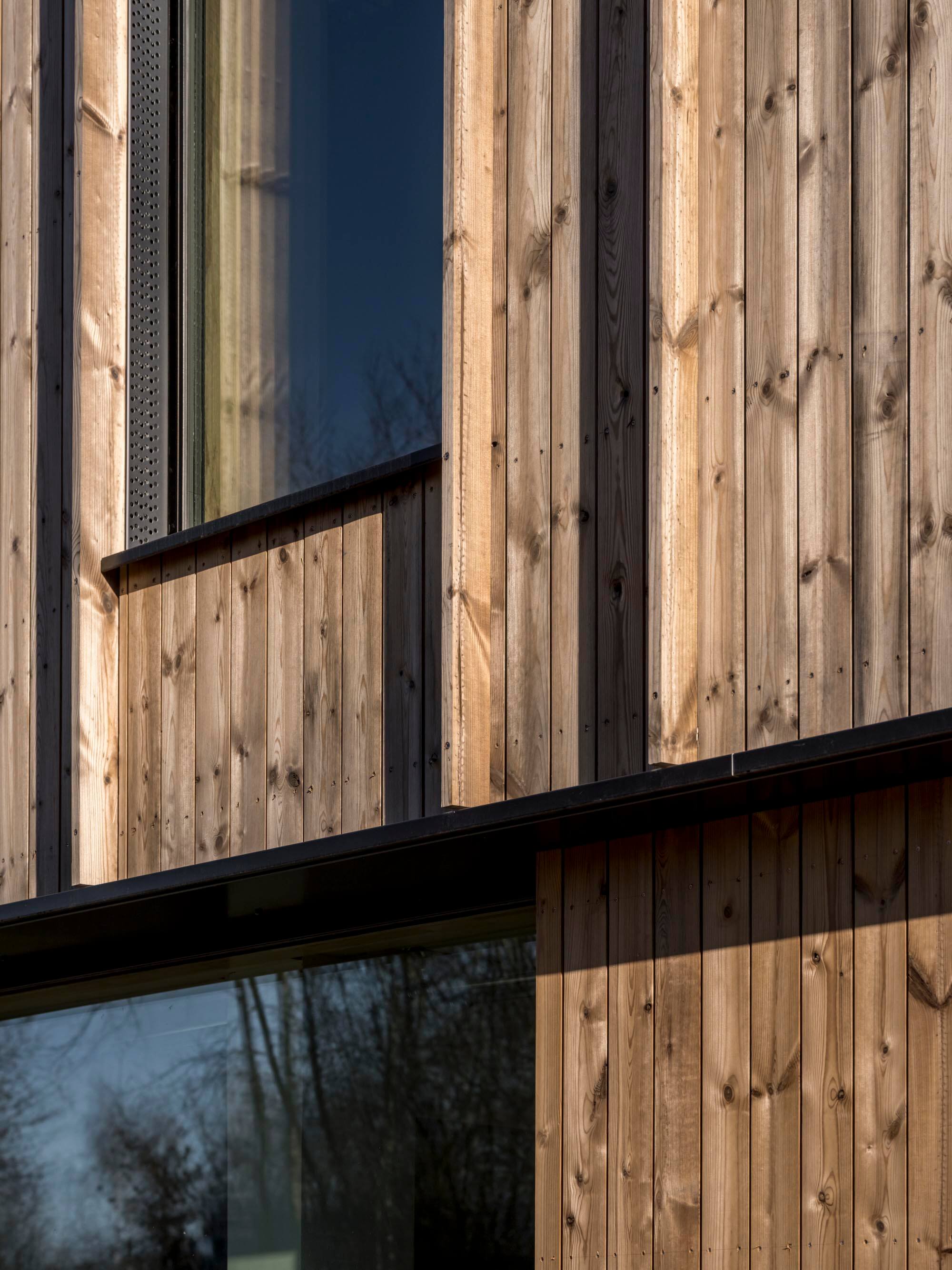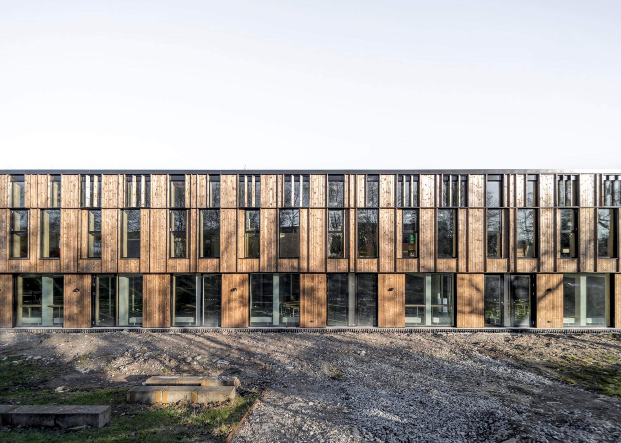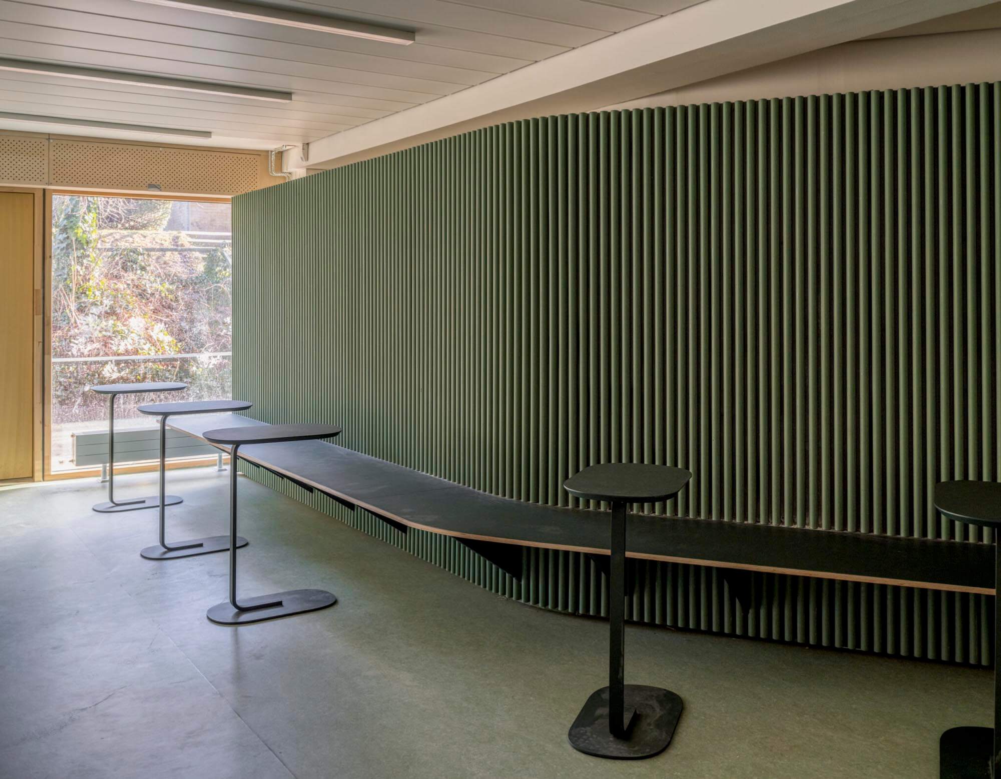 De fleste eksisterende møbler blev omdannet, upcyclet eller direkte genbrugt. Facaden blev også beklædt med resttræ, hvilket understøttede skolens bæredygtige profil.