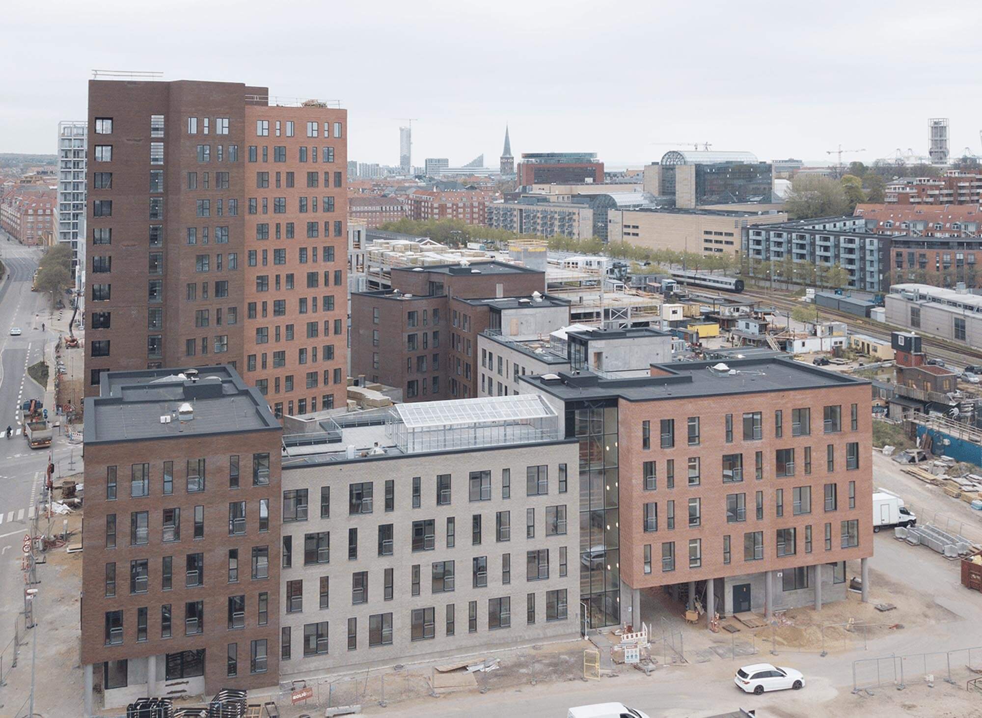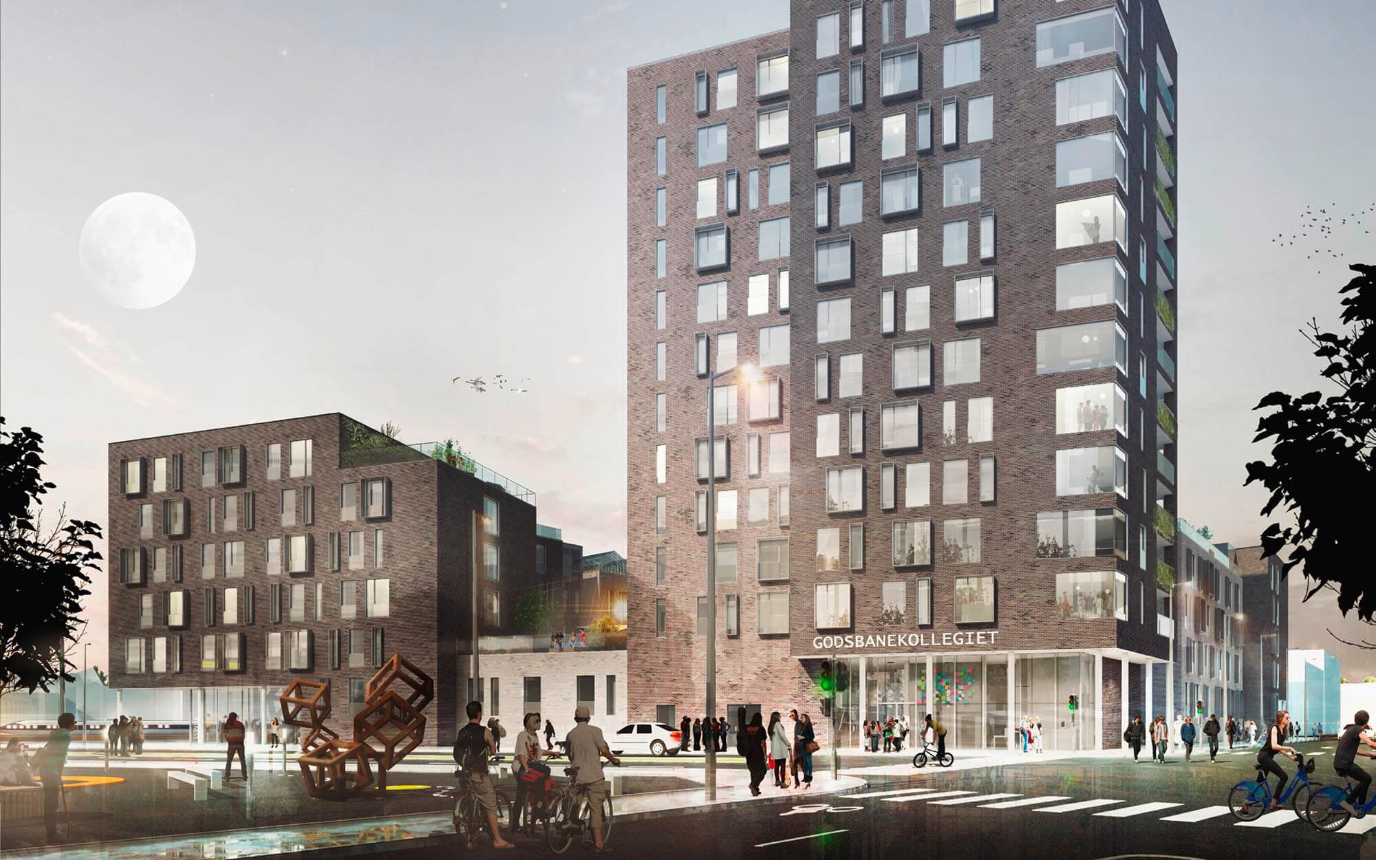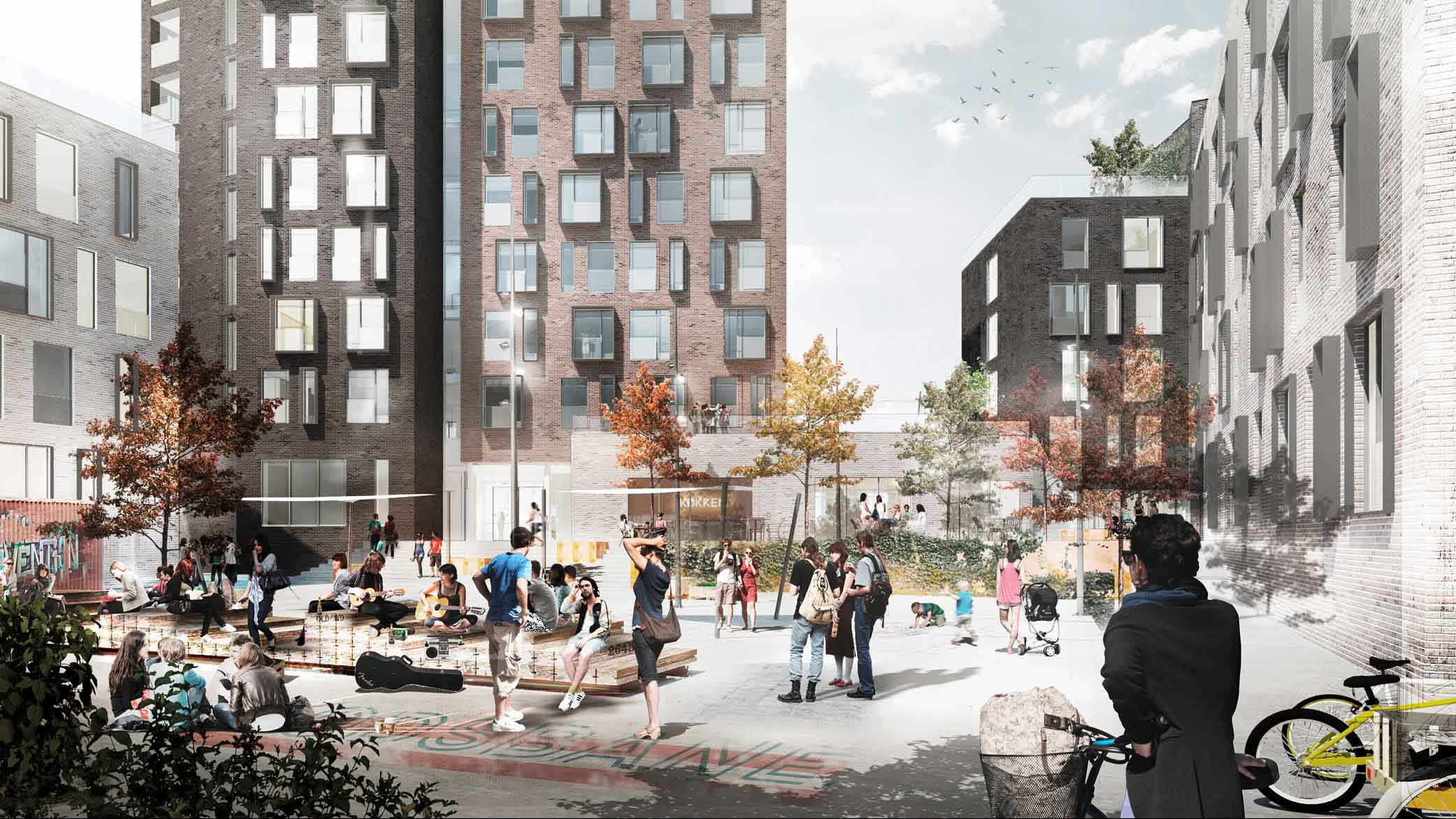 Dertil er etableret et ”studiestræde” med fællesfaciliteter, aktive gårdrum og 5 orangerier på de grønne tagterrasser, der danner rammen for det sociale fællesskab.