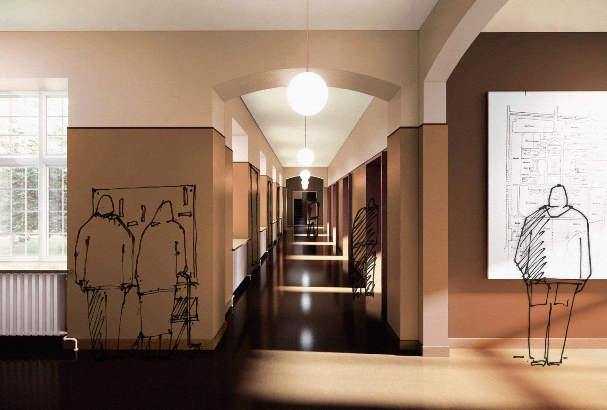 De perioder, der har formet bygningen bliver tydeliggjort og kommer til at glide over i hinanden for at understrege historien fra de 111 år hvor formålet har været psykiatrisk hospital.