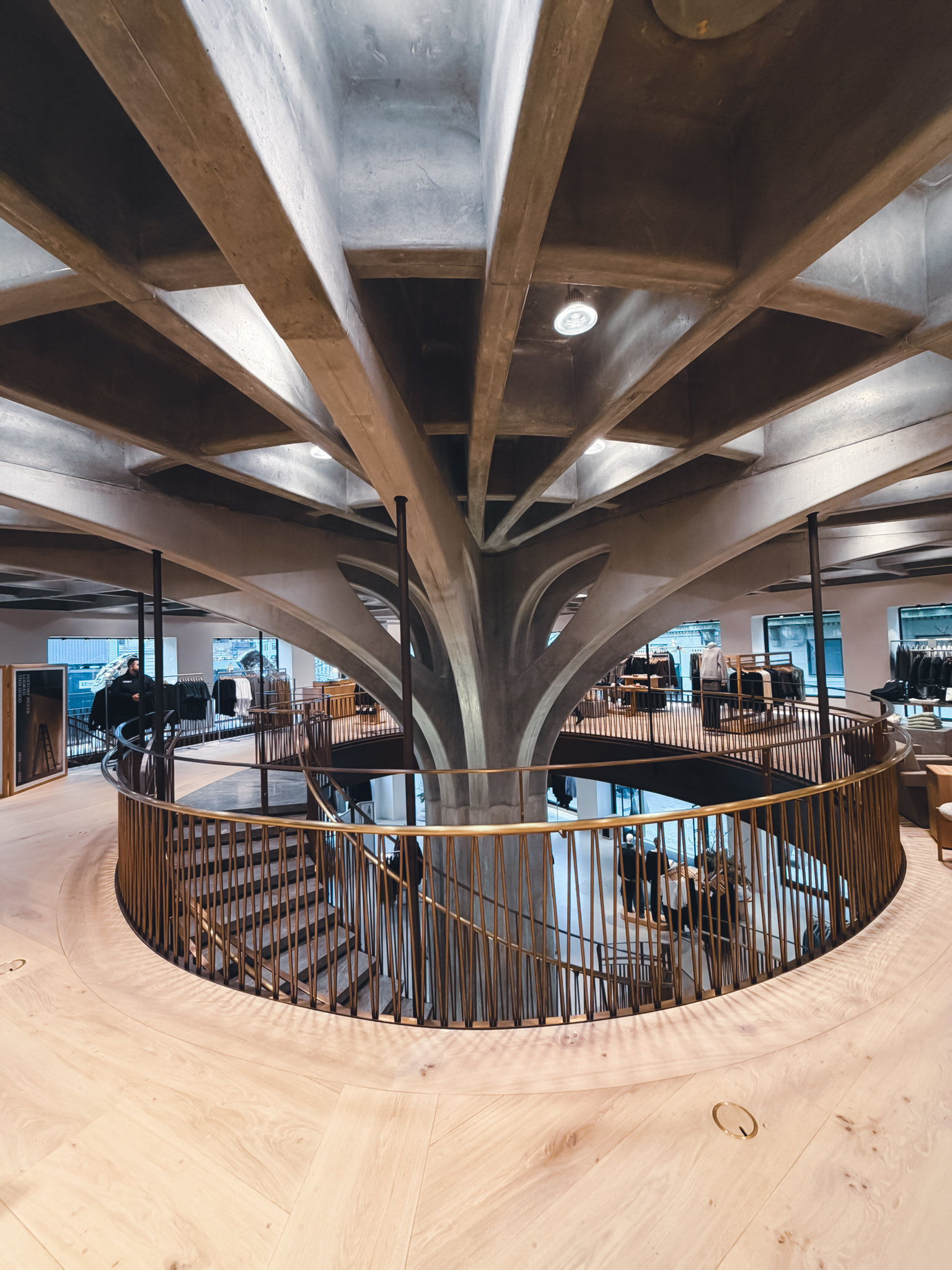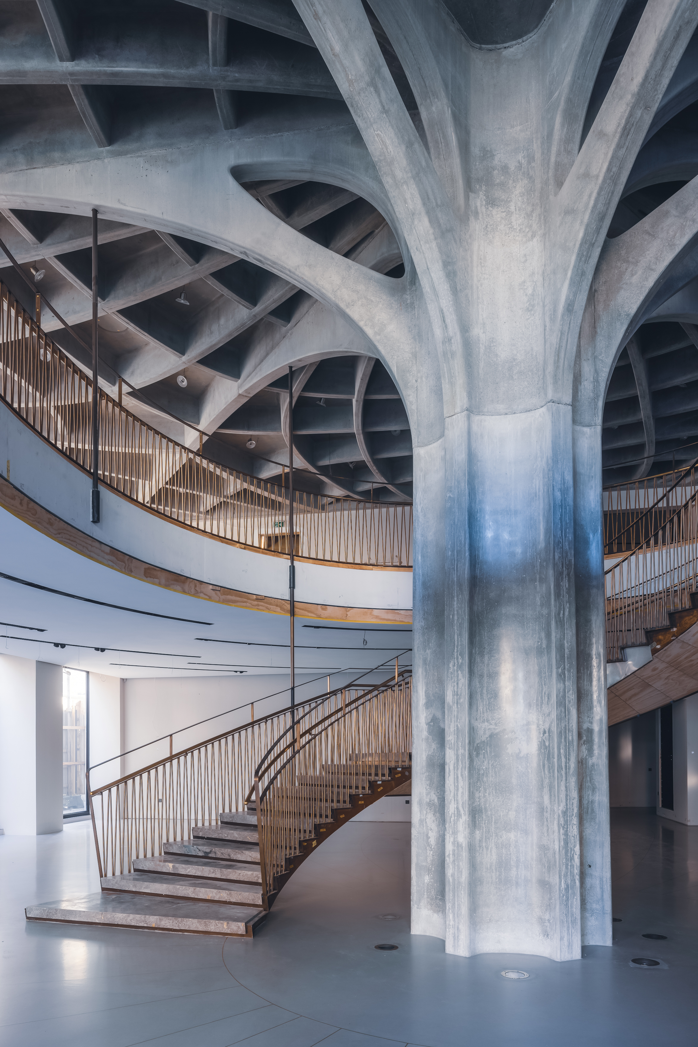 Den indre konstruktion består af en hovedsøjle, der bærer størstedelen af bygningen. Hovedsøjlen er udført med afgreninger i et karakteristisk mønster, der bærer det ophængte dæk over stueplan. Den er organisk i sit udtryk og vækker mindelser til at stå under en gigantisk åkande.