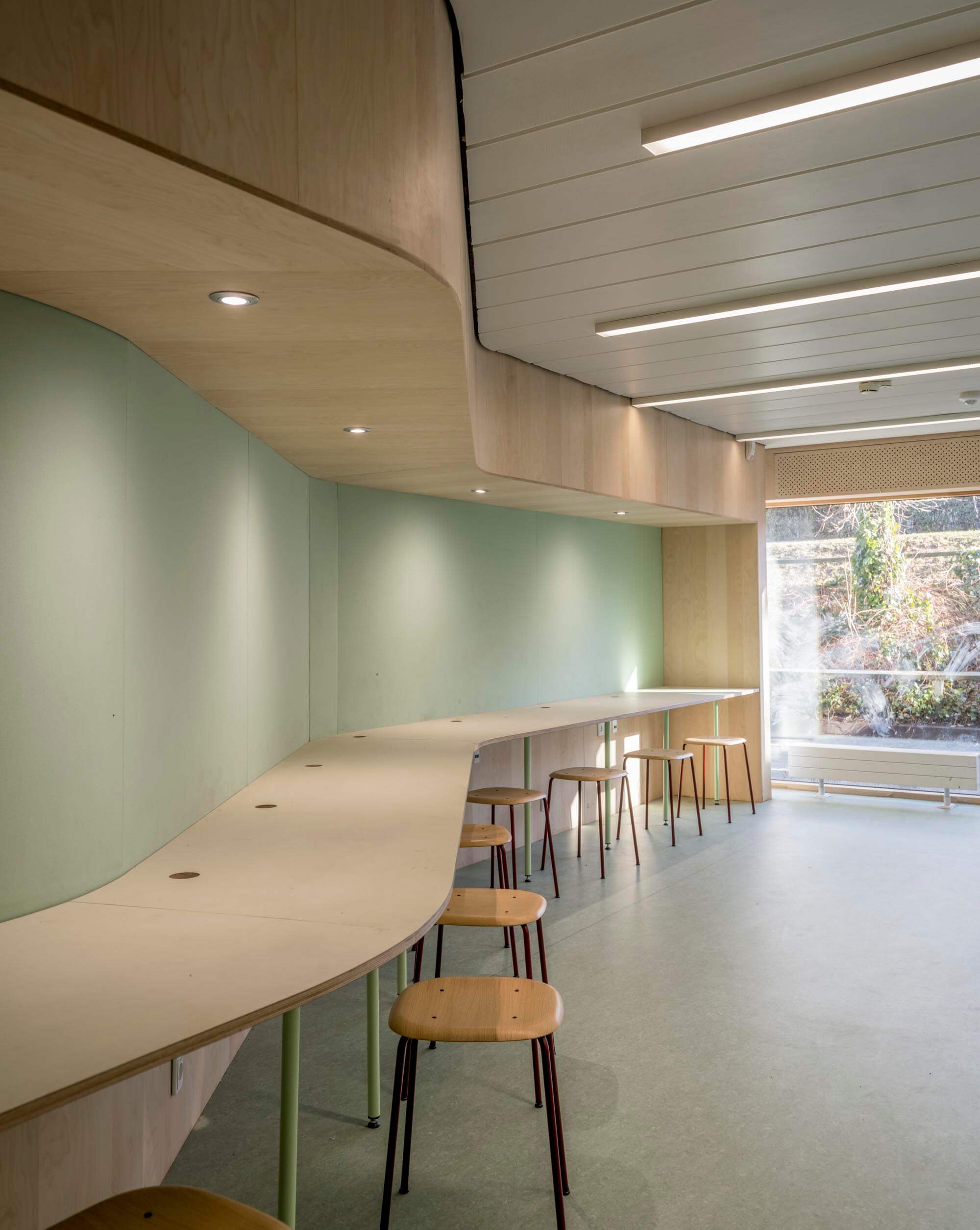De fleste eksisterende møbler blev omdannet, upcyclet eller direkte genbrugt. Facaden blev også beklædt med resttræ, hvilket understøttede skolens bæredygtige profil.